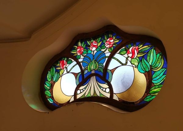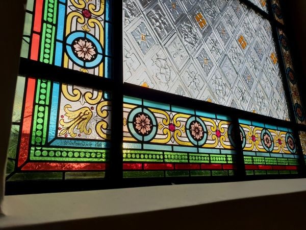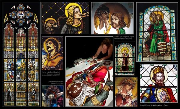 F.J.: A restauráláskor többnyire az üvegek nagy része megmarad. Adott az üvegmezőkön belül az anyaghasználat, a kéznyomok (van, hogy több festő is dolgozott ugyanazon az ablakon), így a hiányzó részek pótlása a meglévőkhöz igazodik. Nagyobb hiányzó üvegdarabokat újra vágok és festek, a törések mentén élben ragasztok és a lepattogott festéket csak hidegfestéssel pótolhatom. Pepecs munka ez. Sok lépcsőn keresztül minden üvegdarab tisztítása, az apró cserepek puzzle-szerű összerakása egy teljes üvegdarabbá nagy figyelmet és türelmet követel.