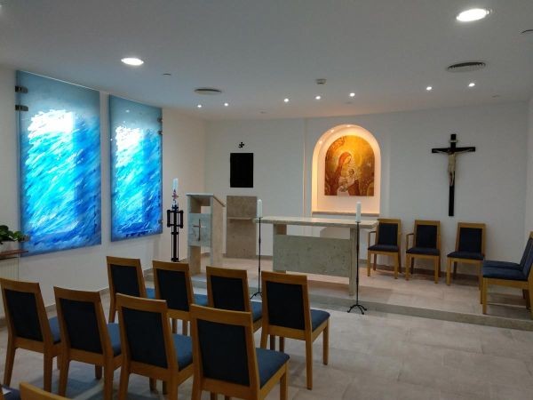 Temesvári Csilla építész barátom már több kápolnát tervezett. Két előzőben Angyal Júlia terveit kiviteleztük, de a harmadik volt az, amit már eleve rám, az én munkáimra építve álmodott meg. Ez az OORI Kalkuttai Teréz anya kápolnája Budakeszin.