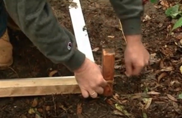 Helyezzünk el egy háromszög alakú szerkezetet a pergola elülső szélénél és feszítsünk ki egy zsinórt a hátsó sarokig, úgy, hogy az elülső cölöpnél derékszög keletkezzen, a hátsó cölöp pedig legyen teljesen egy vonalban ezzel!