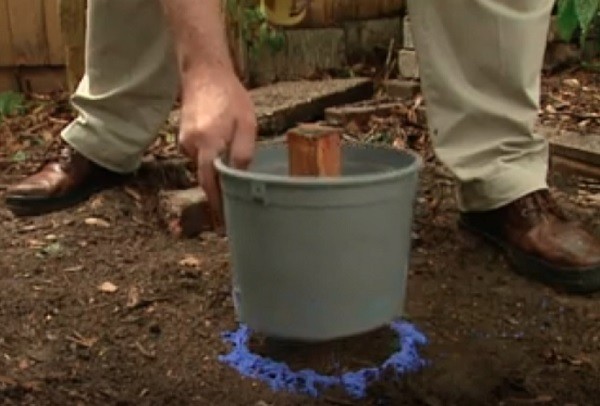 Húzzunk egy-egy feneketlen vödröt mind a hat cölöpre, úgy, hogy a cölöp pontosan a vödör közepén legyen, majd szórjunk porkrétát a vödör köré, hogy kijelöljük a tartóoszlopok körvonalát! Óvatosan húzzuk ki a cölöpöket, anélkül, hogy elsodornánk a körvonalat!