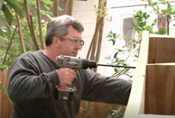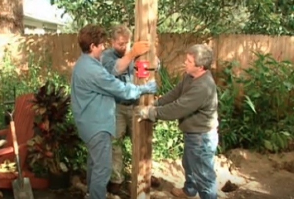 Szórjunk 10-15 centiméternyi kavicsot a lyukakba, hogy megakadályozzuk a víz beszivárgását és a faanyag elrohadását! Szúrjunk egy-egy kétméteres tartóoszlopot a lyukakba és vízmértékkel győződjünk meg róla, hogy teljesen egyenesek-e! Szükség esetén átmenetileg meg is támaszthatjuk őket.