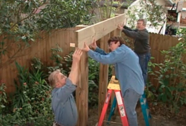A pergola építése a keresztgerendák felszerelésével válik teljessé, amelyeket egyenlő távolságra helyezzünk el az elülső és hátsó gerendák között.